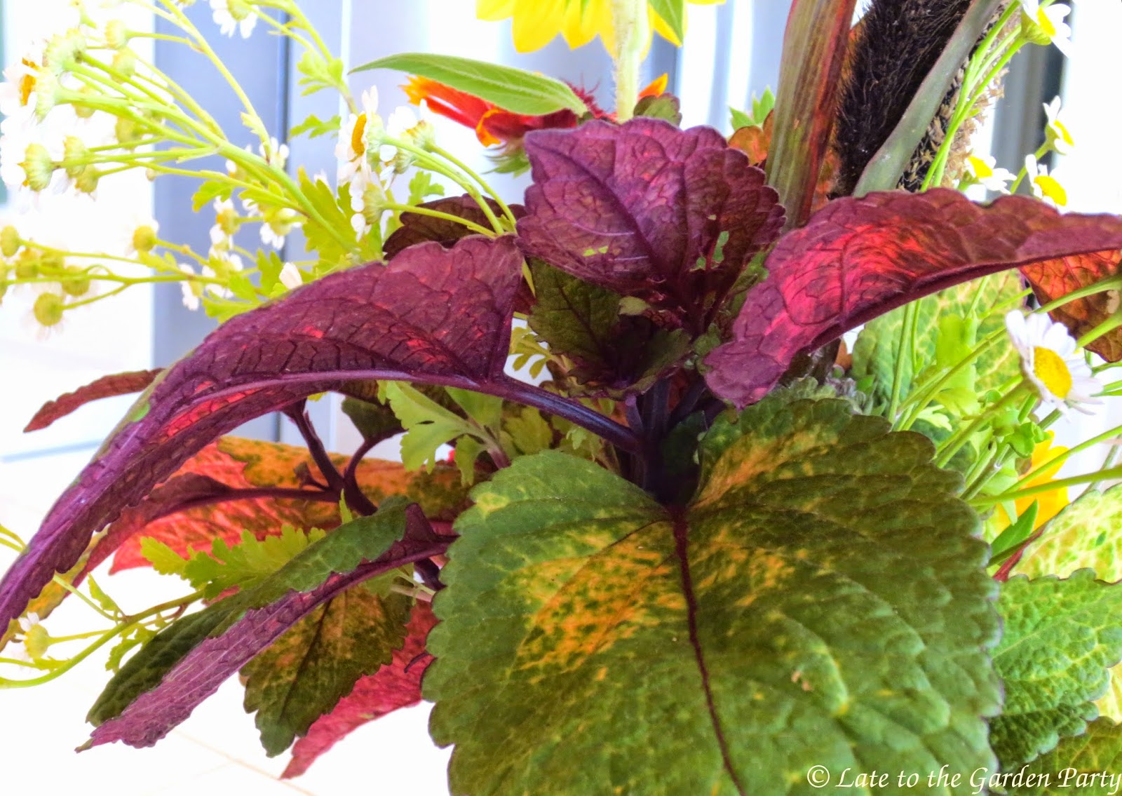 Coreopsis 'Redshift,' there's nothing much available in sufficient quantity to make an impact in a vase. Most of the flowers also don't coordinate well with one another. I considered constructing a vase solely with foliage material but, after cutting a mass of colorful coleus 'Honey Crisp,' I was able to find a few flowers that provided a nice floral accent to the variegated foliage of the coleus (
