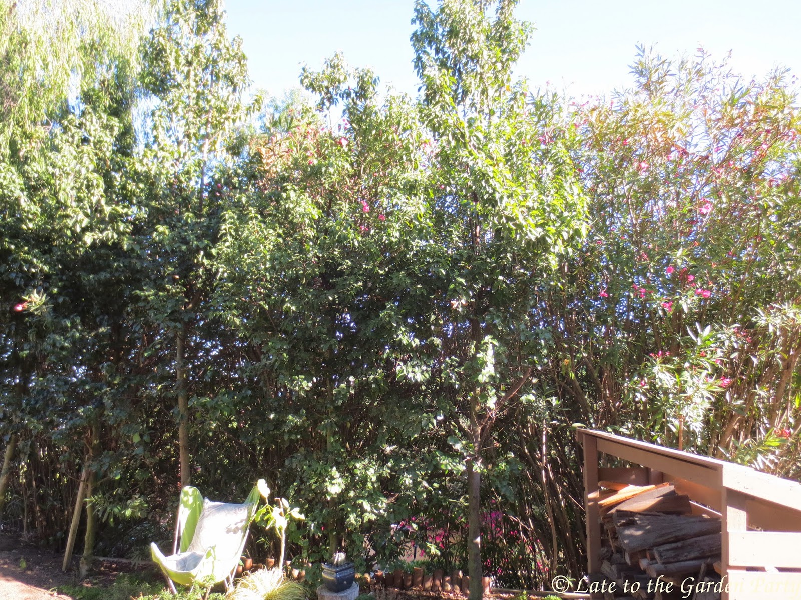 It turns out that the oleander officially belongs to us, which came as a surprise as it's largely invisible from the inside of our property. Another shrub backs the oleander on our side, mostly screening it from view. I'd assumed that this marked the edge of our property but the oleanders, which can only be accessed from the neighbor's driveway, are ours. Why someone installed a hedge within a hedge here, I don't understand. I also don't understand why the dividing line between the properties was designed in this fashion but, as the houses were built in the 1950s and the original owners are long gone, there's no one to provide an explanation.
