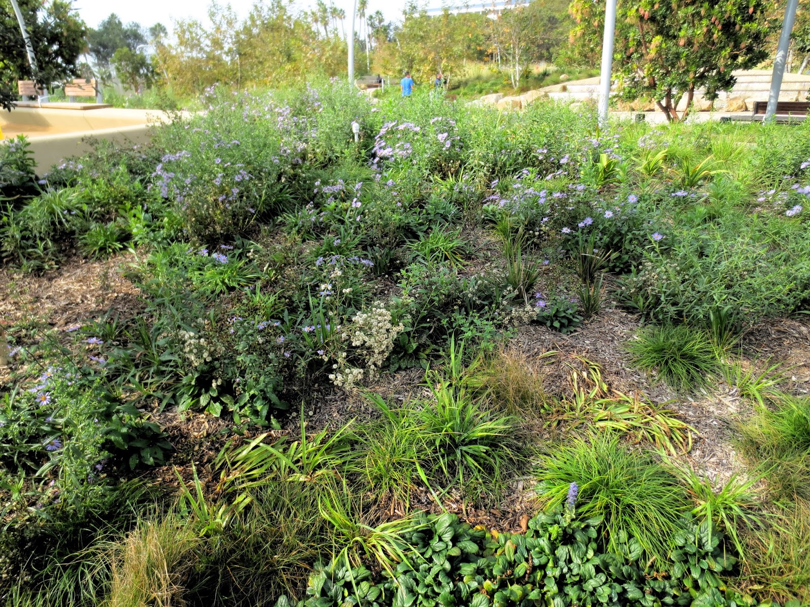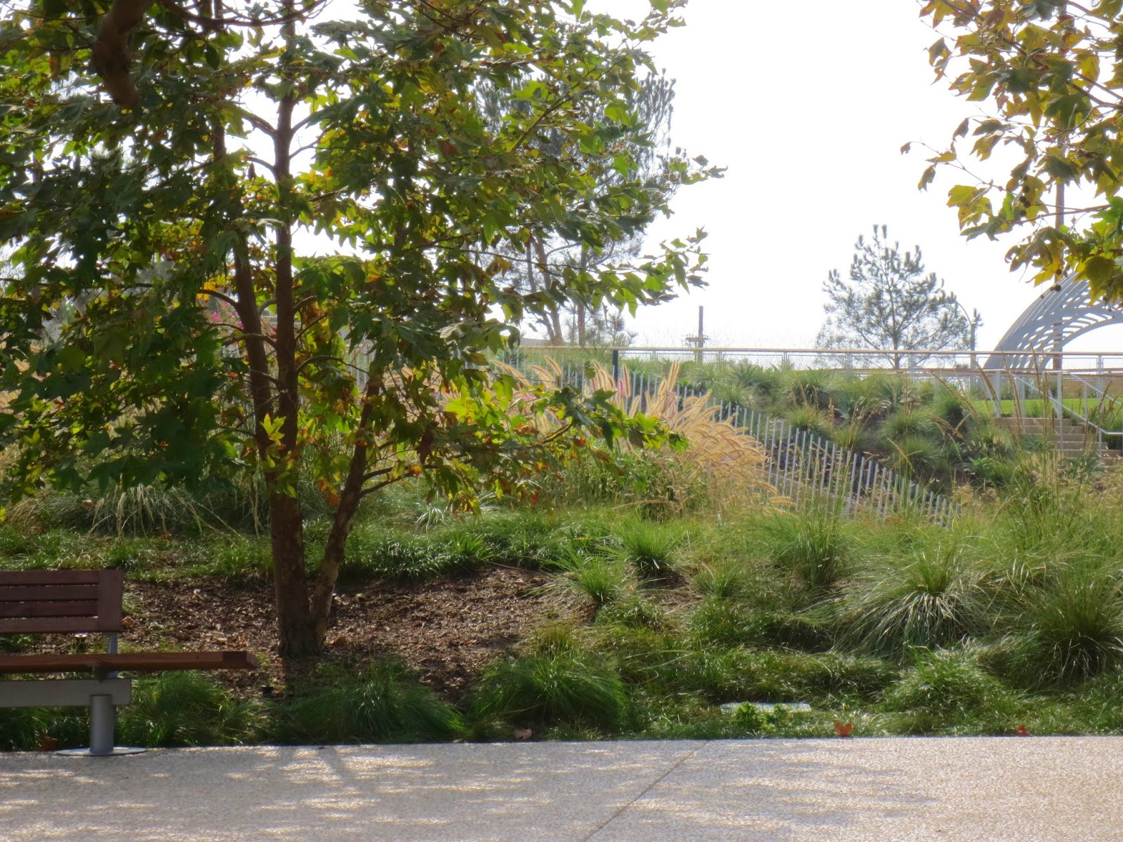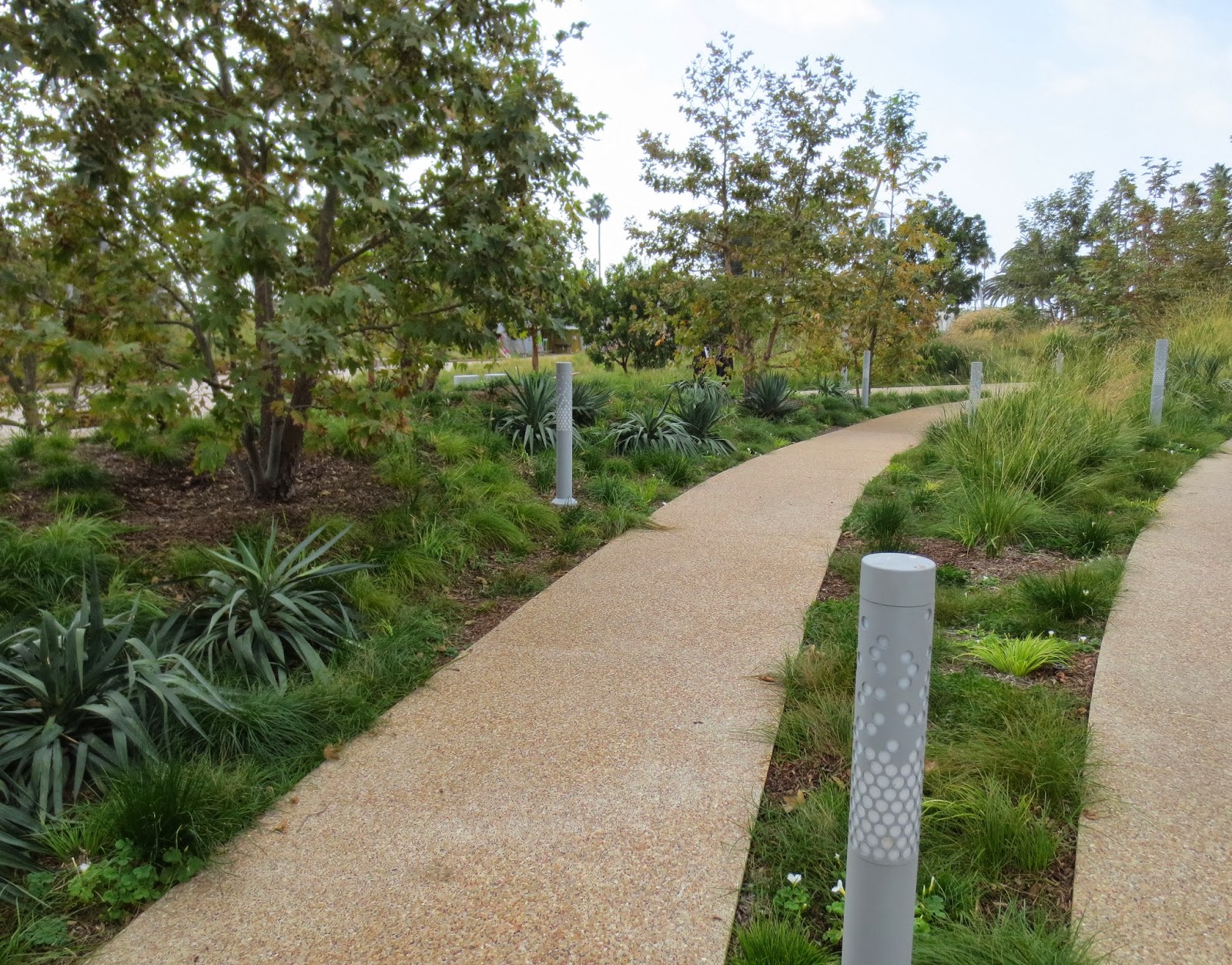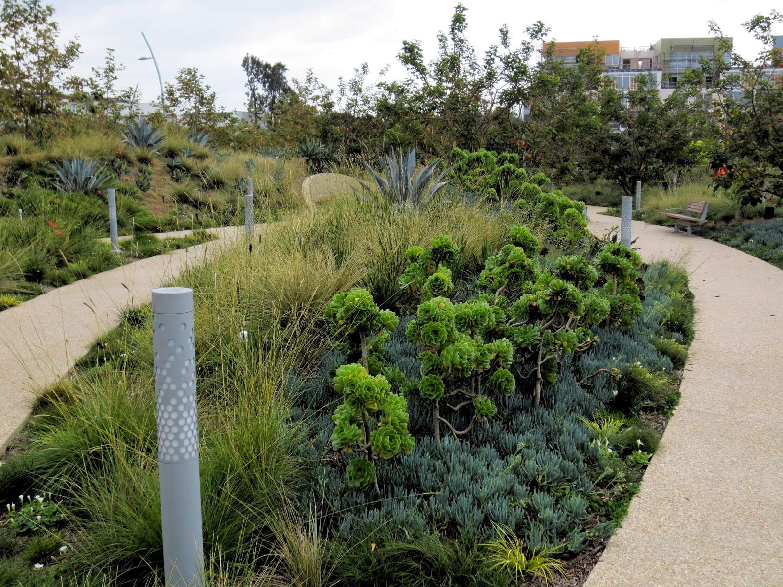 Wide paths cut through the space, which is heavily planted with climate-appropriate grasses, succulents, trees and other plants.