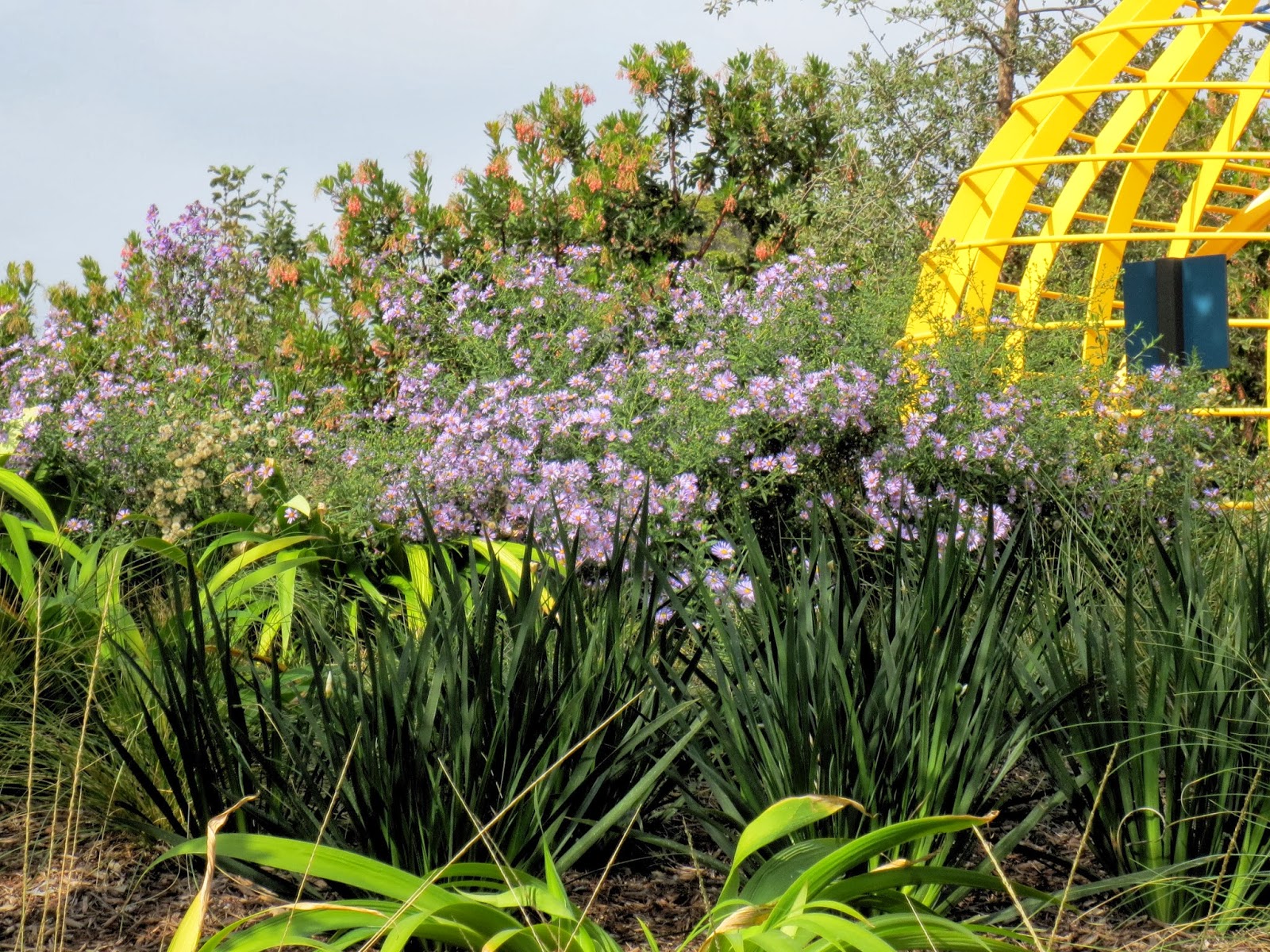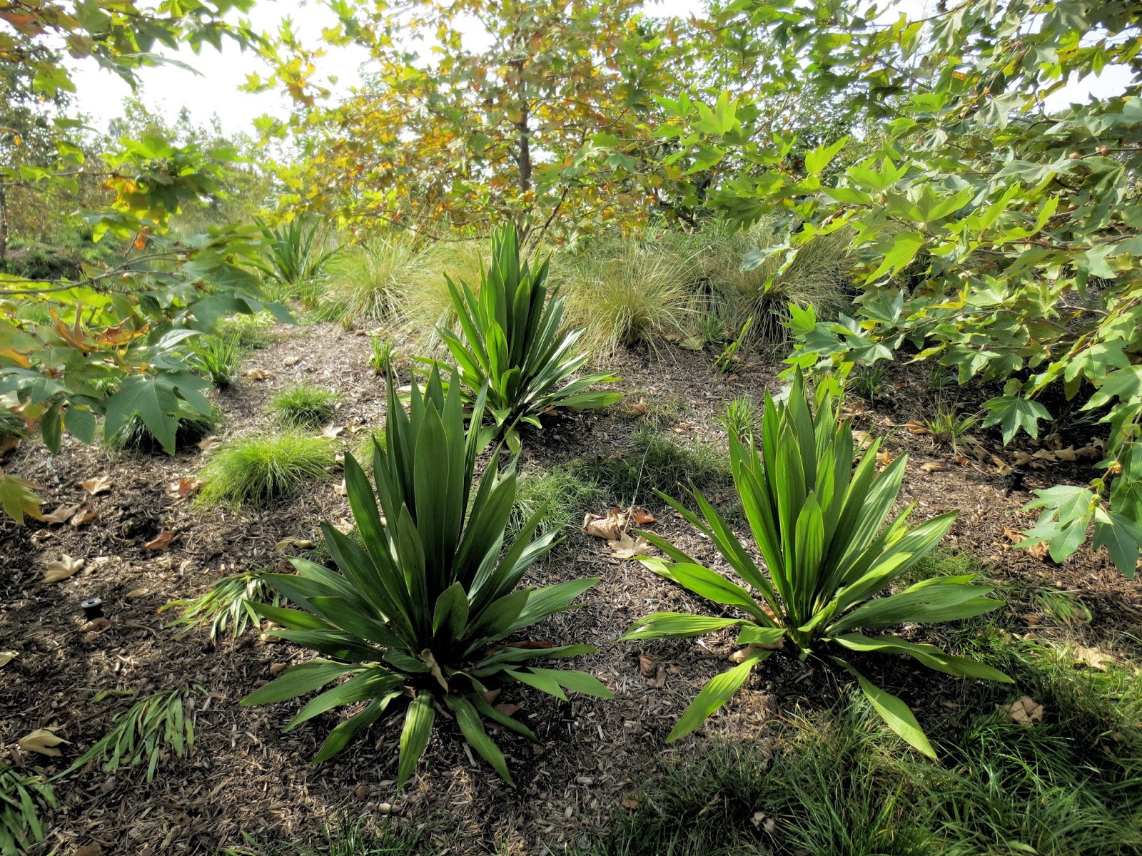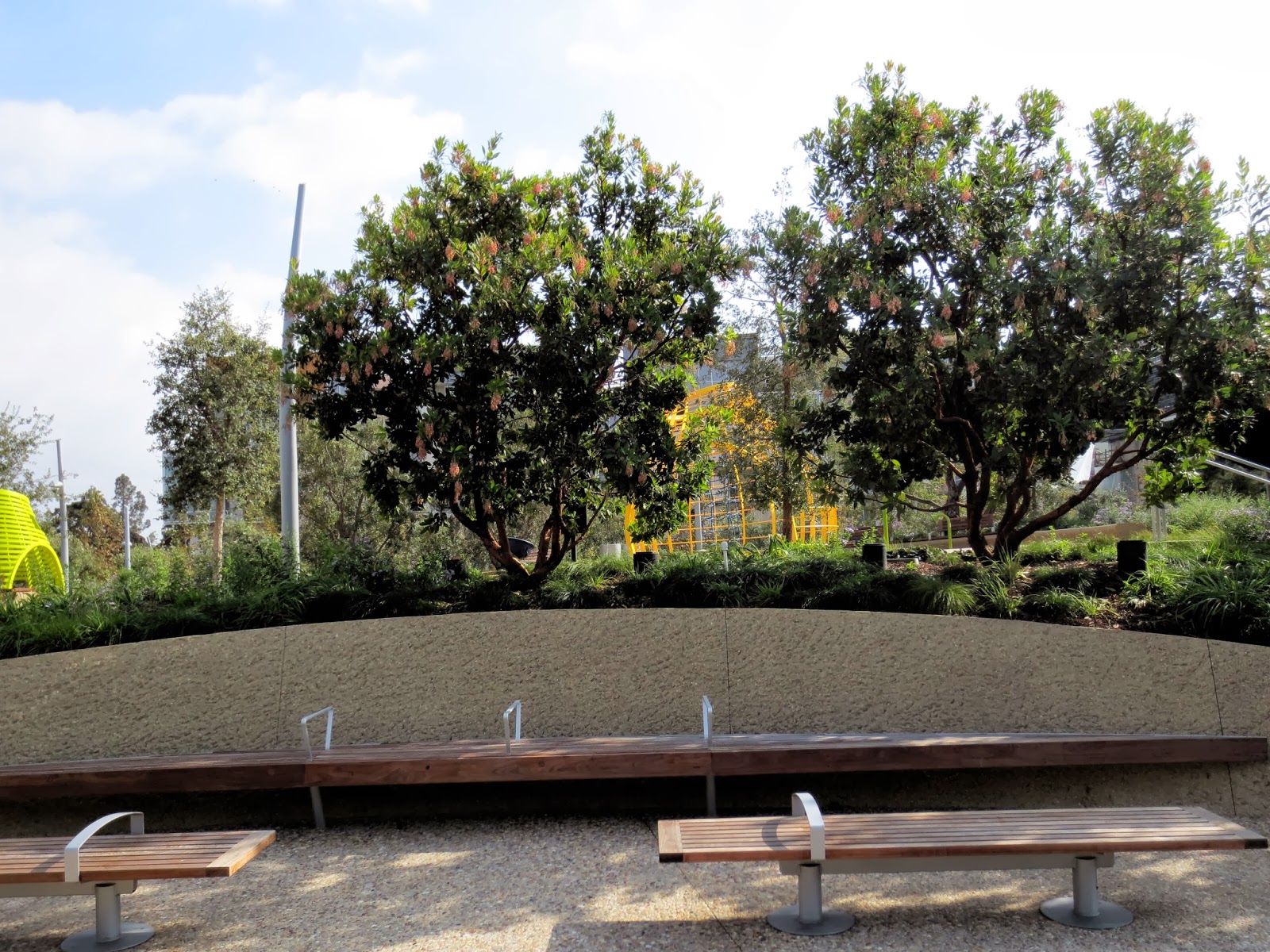 Wide paths cut through the space, which is heavily planted with climate-appropriate grasses, succulents, trees and other plants.