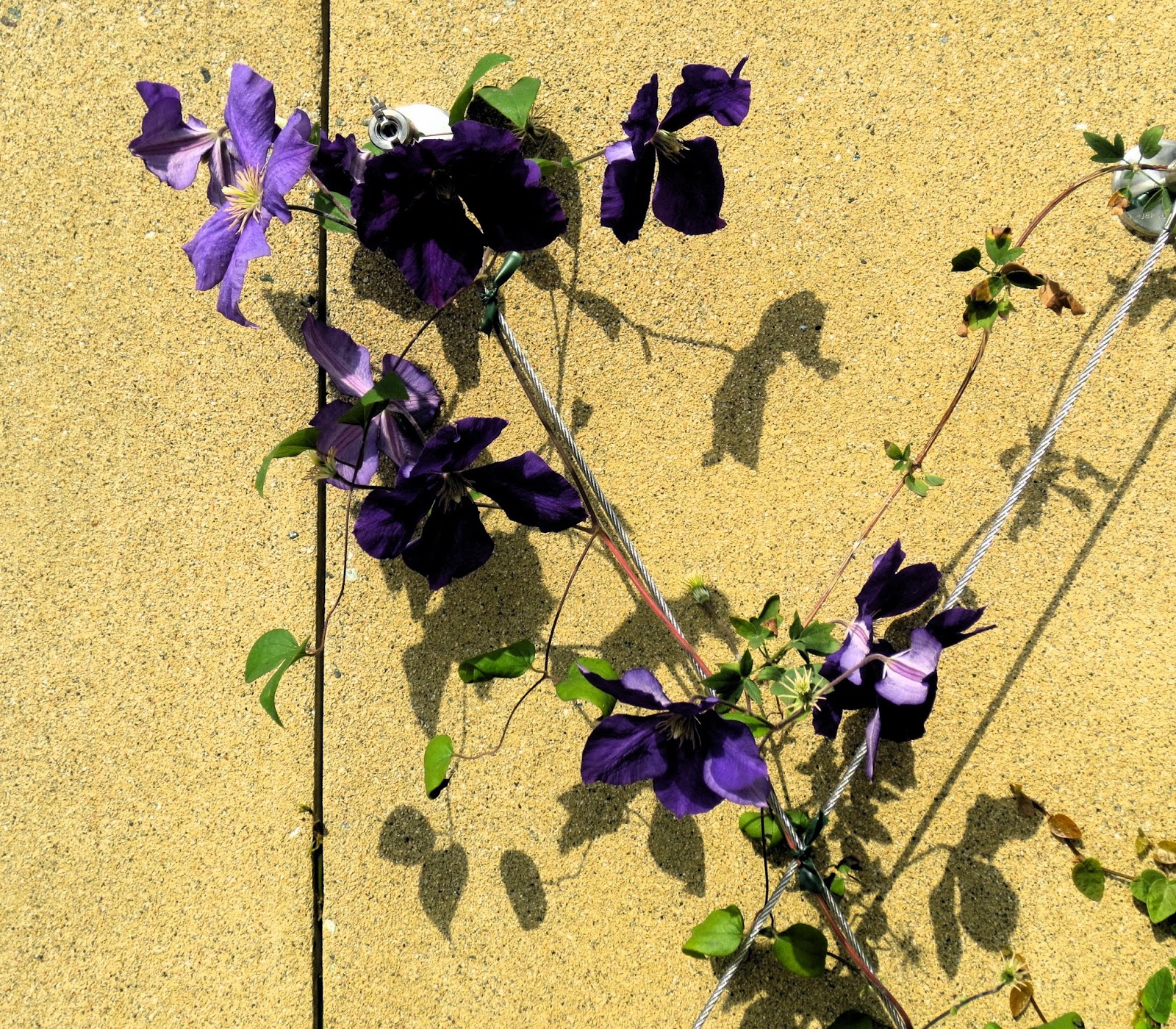 Clematis vines are being trained to grow up the wall enclosing the restrooms.