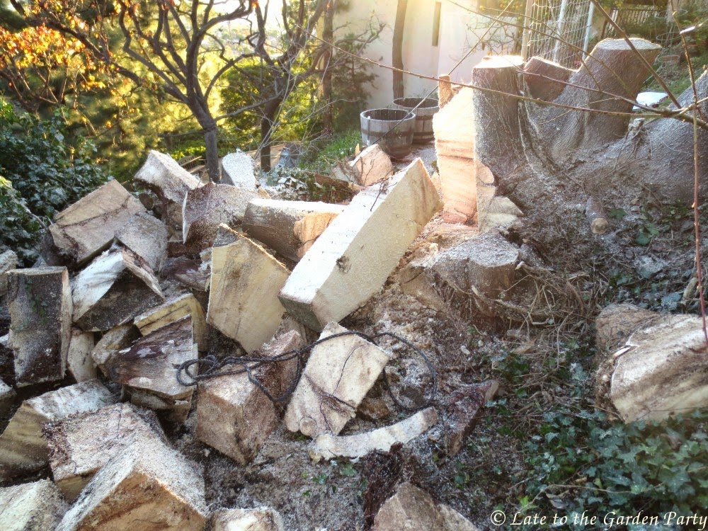 | The lattice and pots beyond the stumps sit on the neighbor's property |