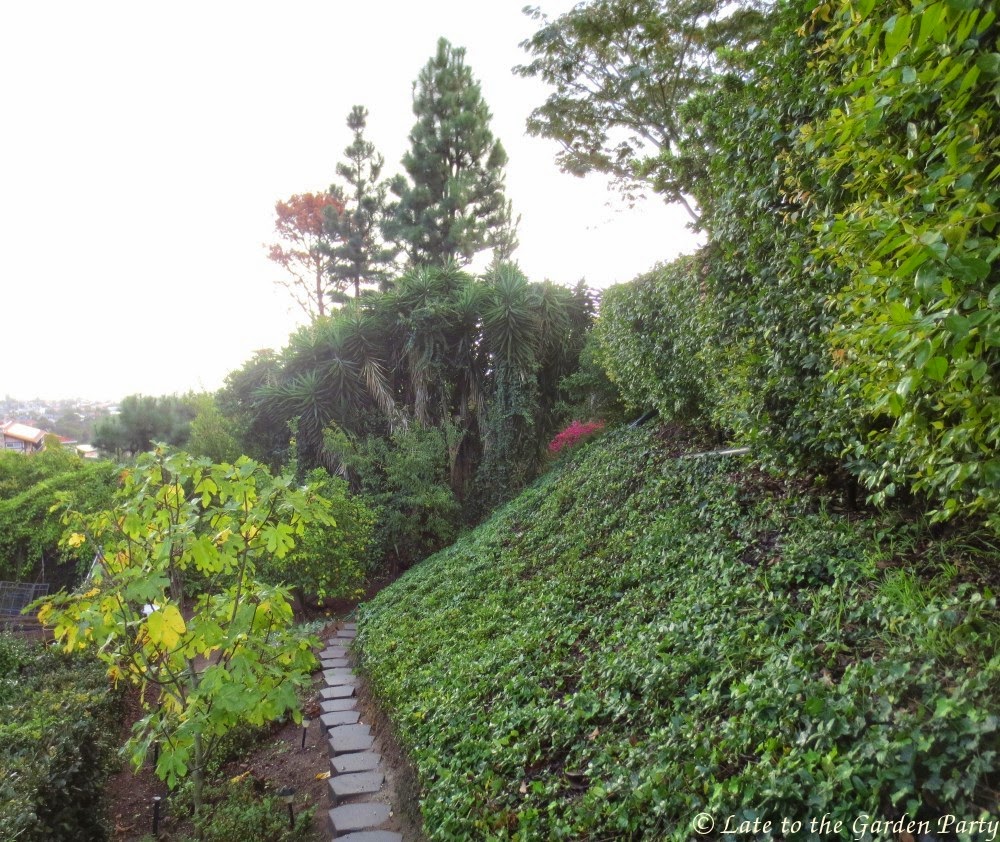 Yucca was already tree-height 34 years ago when they moved in and I know the wife was upset by its removal. The privacy issue is also greater for them - we're impacted only when we're on the back slope but they face the newly bare area every time they go into their backyard. The Pittosporum, a handsome if unexciting plant, has the advantage of being fast-growing, reaching a height of 6 feet in as little as a year. In a group of 3, it should provide an effective screen, while allowing light and air to move easily through it. It's also moderately drought tolerant.