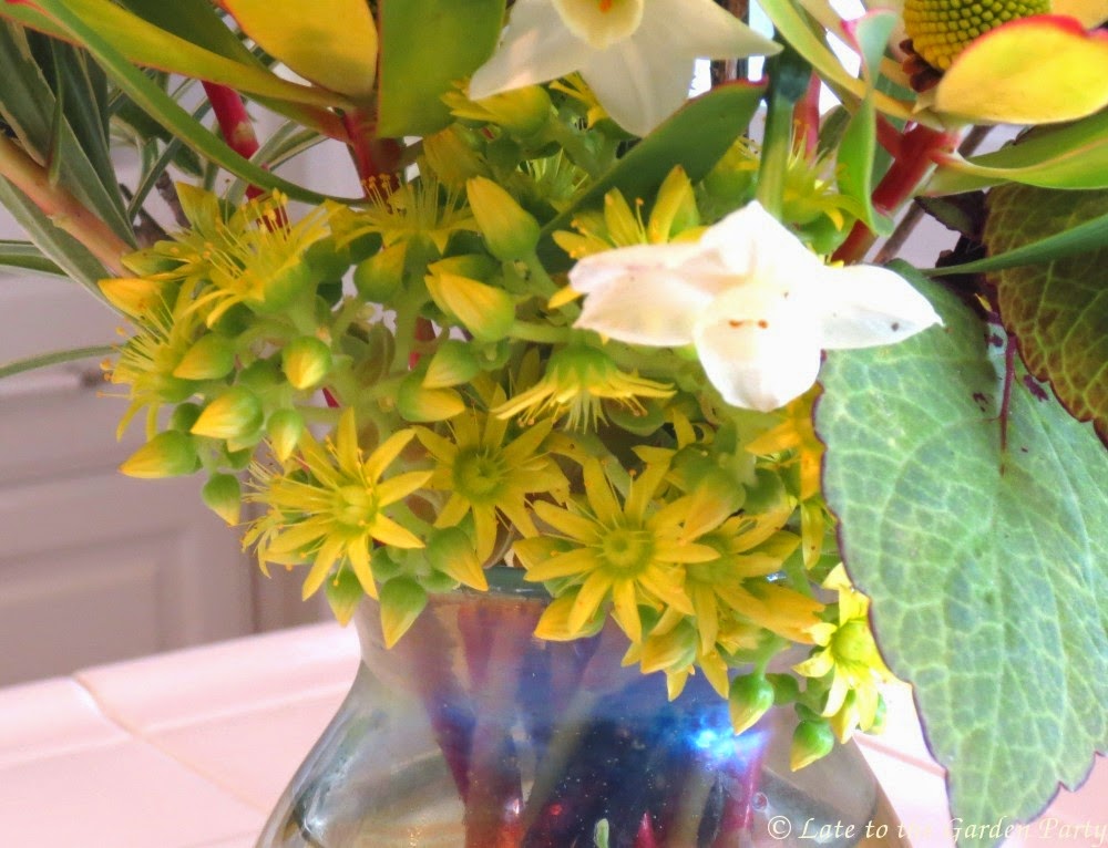| While clipping stems of Leucadendron 'Wilson's Wonder,' I decided to take some of the yellow blooms of the Aeonium sitting alongside it too |