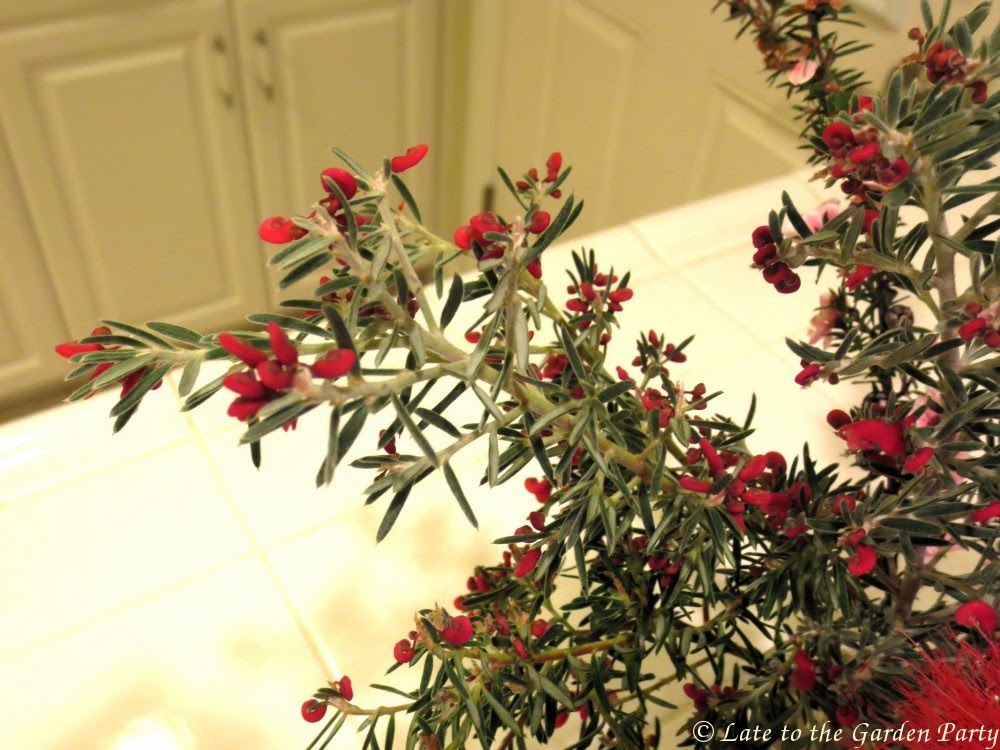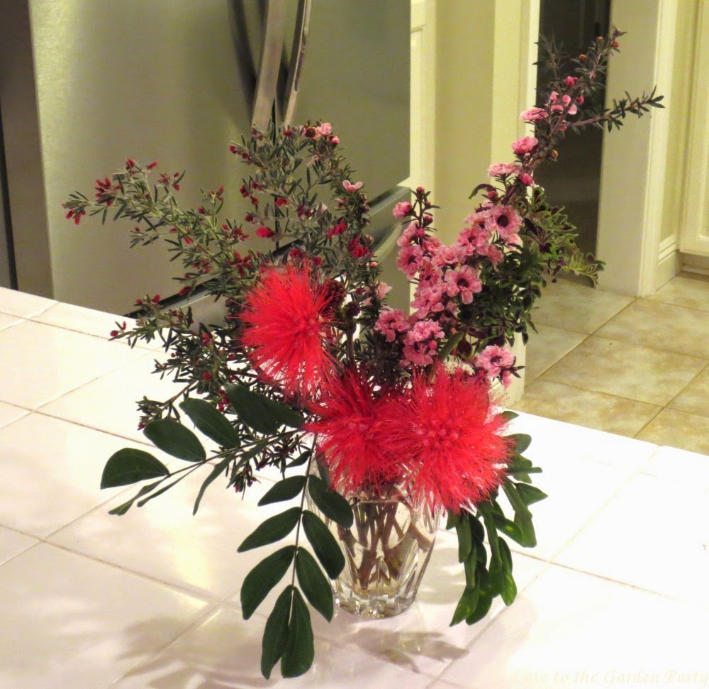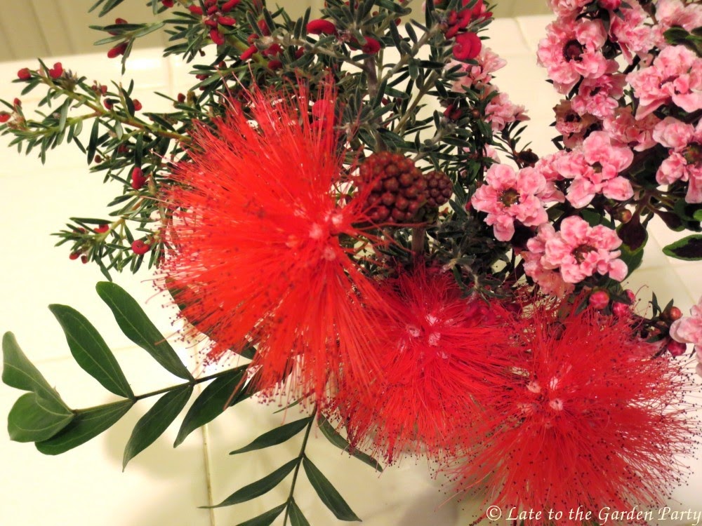 Calliandra haematocephala, missed by the gardener's hedge trimmers during the holiday period, are sporting more blooms than usual so I clipped a few of those as well. They don't last long in a vase but they don't stay fresh on the shrub long either.