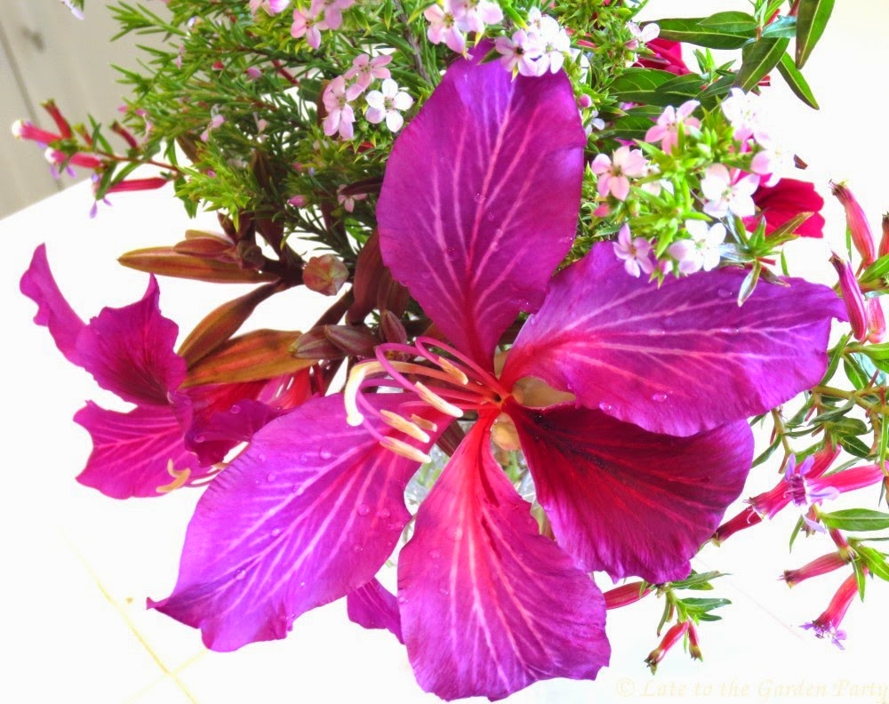 Bauhinia x blakeana tree had been loaded with flowers before our last rainstorm but it was in a sorry state when Bloom Day came around, with its pretty petals all over the ground. It has since recovered some so, even though the blooms don't last long in a vase, I decided they deserved a moment in the spotlight.