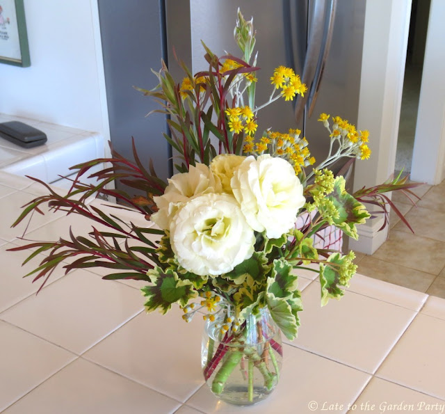 As a counterpoint to the dark tones of the first vase, I created another one that is its polar opposite, light and bright. It features the pale yellow Eustoma grandiflorum, which has finally bloomed in my backyard border.