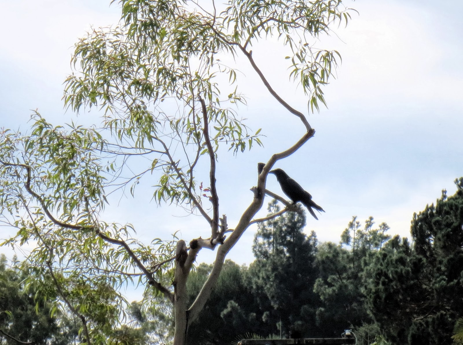 Schinus molle) dropped all over our property. At first, I assumed that the gardener had trimmed some of these for unknown reasons and forgotten to clean up after himself. Then I speculated that the Santa Ana winds had brought them down. But the volume of debris kept increasing so I soon concluded that neither of those explanations made sense. Finally, I discovered the culprits sitting atop one of the pepper trees, tearing out branches before flying off. Crows! Assuming that they carried off half of what they left behind, they did a pretty thorough job thinning out the foliage of several of our 7 pepper trees.